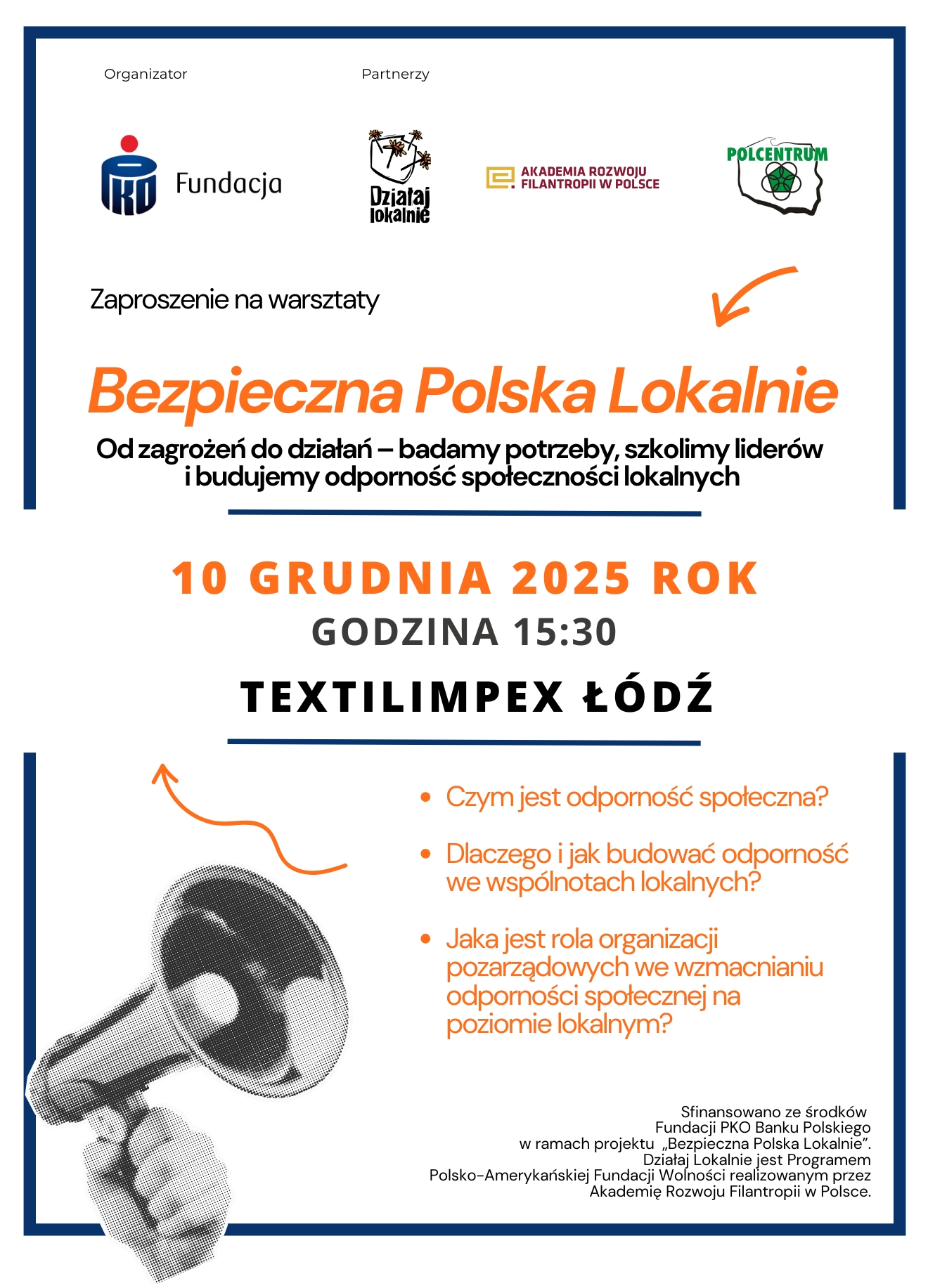 serdecznie zapraszamy do udziału w spotkaniu „Bezpieczna Polska Lokalnie. Od zagrożeń do działań – badamy potrzeby, szkolimy liderów i budujemy odporność społeczności lokalnych”, które odbędzie się 10 grudnia 2025 r. (środa) o godz. 15:30 w TEXTILIMPEX, ul. Gen. Romualda Traugutta 25, 90-113 Łódź.